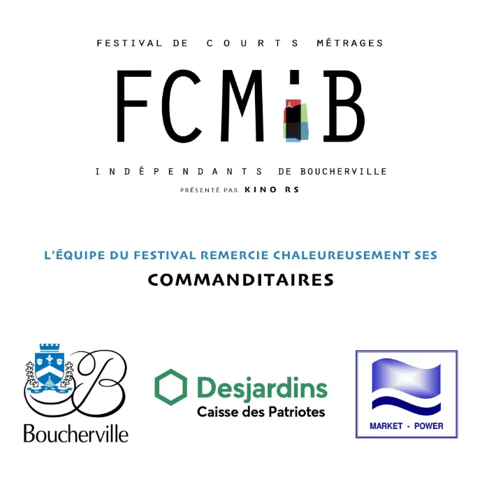 L'équipe du Festival de Courts Métrages Indépendants de Boucherville remercie chaleureusement ses commanditaires ! La Ville de Boucherville, Desjardins Caisse des Patriotes et Market Power soutiennent le FCMIB depuis de nombreuses éditions, et la tenue du Festival ne serait pas possible sans leur aide et leur confiance.